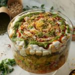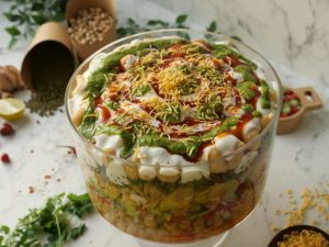 -Deep serving dish mein boiled chanay,chaat masala,lal mirch crushed,tayyar hari chutney,mixed vegetables salad,boiled aalo,tayyar meethi chutney,mong phali,sev nimco,tayyar dahi,meethi chutney,hari chutney,papri,boiled sabut mong daal,chaat masala,dahi phulkiyan,dahi,meethi chutney,hari chutney,lal mirch crushed aur sev nimco dal ker serve karein!
