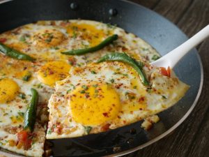 -Ek,ek ker ka anday shamil karein,lal mirch crushed aur hari mirchein dal ker dhak dein aur halki ancch per 6-8 minutes kliya paka lein.