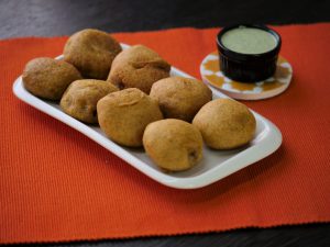 Grease hands with oil,take a mixture and make a flat round balls and coat in prepared gram flour batter.