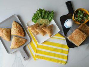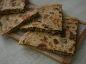 Roll out another dough and put filling/stuffing in the center, place another round dough on top, seal edges and roll out carefully with the help of rolling pin.
