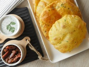 Dough balls bana len aur unko 5 minutes rest karke poori roll out kar len. Poori ko centers se thick rakhen jese wo asani se puff up hojaye.