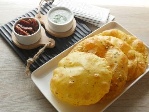 Now deep fry the puris in properly heated oil and while frying gently press them so that they may puff up.