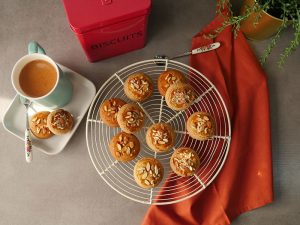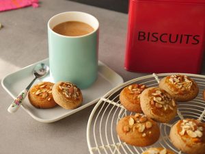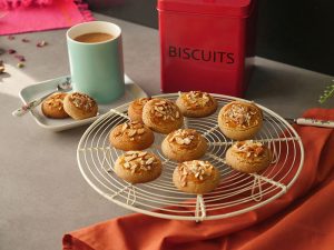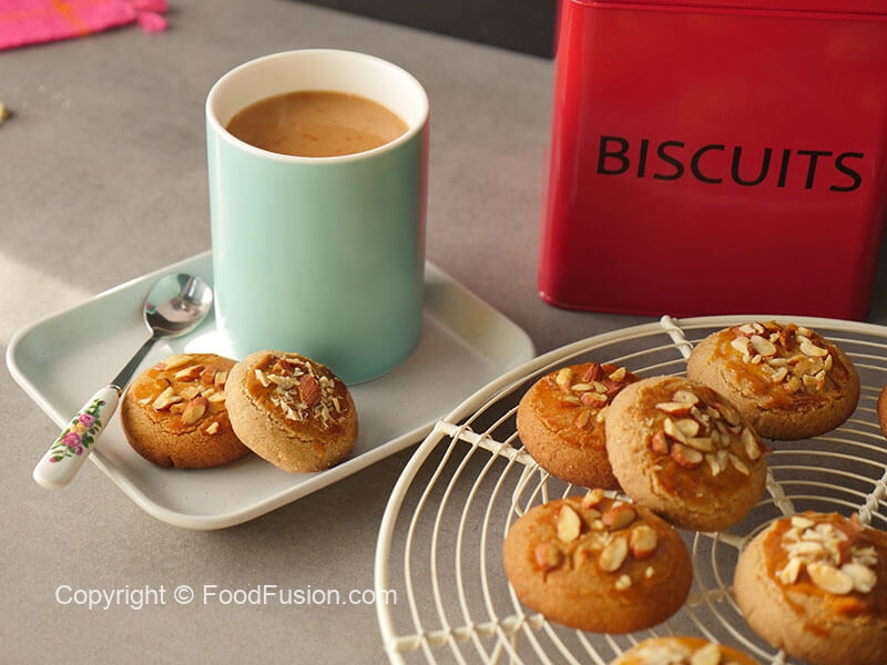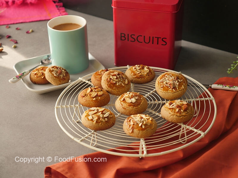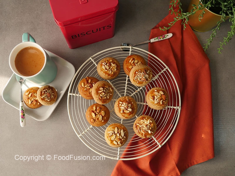 Place them in a baking tray,apply egg yolk with the help of brush,add almonds & press gently (keep some space between them as they expand while baking).