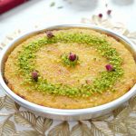 -Pour warm sugar syrup on hot kunafa & garnish with pistachios,rose buds & serve!