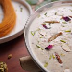 -In a serving dish, add badami sheer khurma, garnish with pistachio, almonds, dried rose petals & serve!