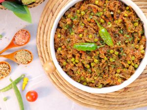 -Add green chilli,grated eggplant,peas,pink salt,turmeric powder,coriander seeds,red chilli powder, cumin seeds,kashmiri red chilli powder,fennel seeds & mix well.