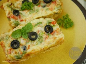 Pour the mixture in the tray compartments and put cheese and few olives on top of it.