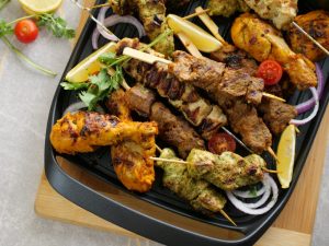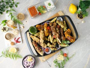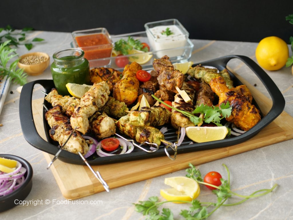 Malai boti,chatpatti bbq beef boti,hari chutni boti aur drumsticks ko grill ker lein (4-5 minutes each side) aur bech bech mein oil lagatay rahein.