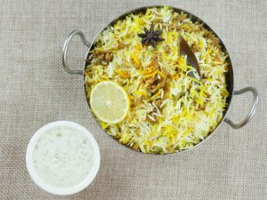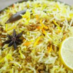 Now for Biryani layers: add mint leaves, green chilies, lemon slices, than add a layer of boiled rice. Sprinkle yellow food color. Cover and cook for 10-15 minutes on low flame.