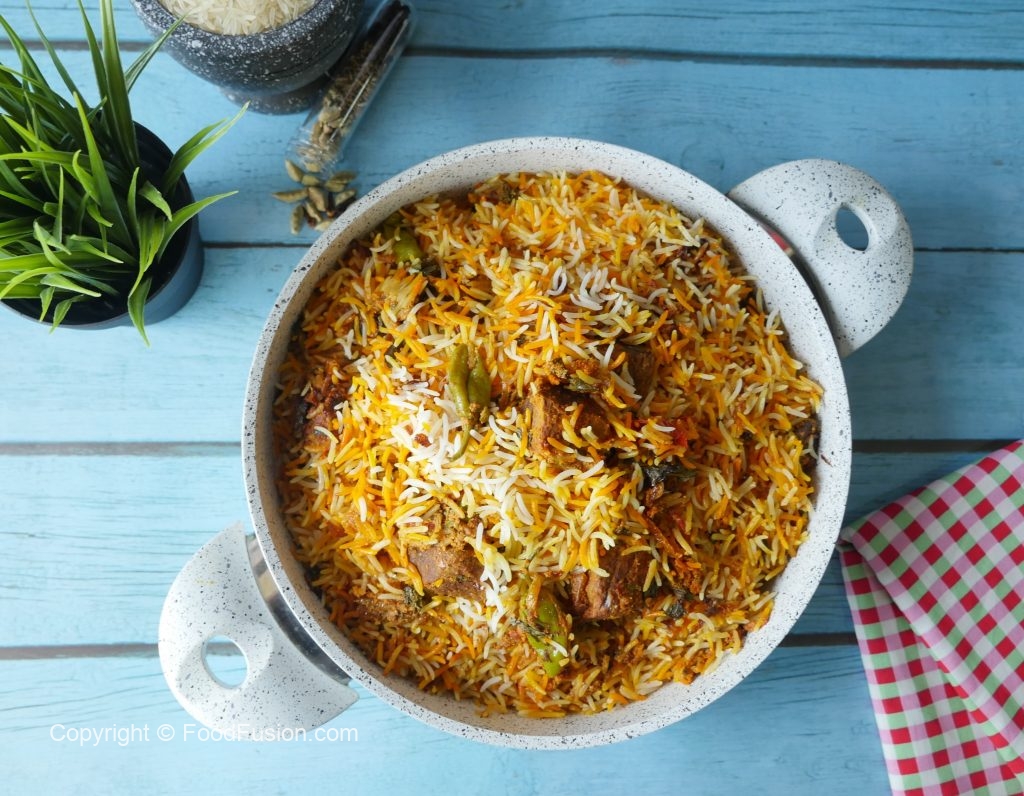 Add & spread half quantity of boiled rice,reserved gravy,steam cooked beef pieces,fresh coriander, mint leaves,fried onion and remaining quantity of boiled rice.