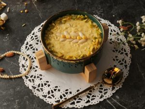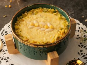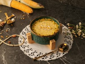Garnish with almonds,corn kernels,pistachios & serve chilled!