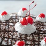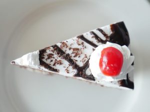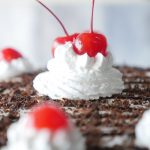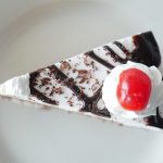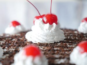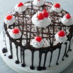 Decorate cake with chocolate syrup,chocolate,piping whipping cream & cherries.
