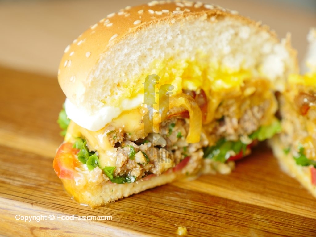 On burger bun,spread mayonnaise,add tomato,lettuce leaf,burger patty,caramelized onion,fried egg and cover with the top bun.