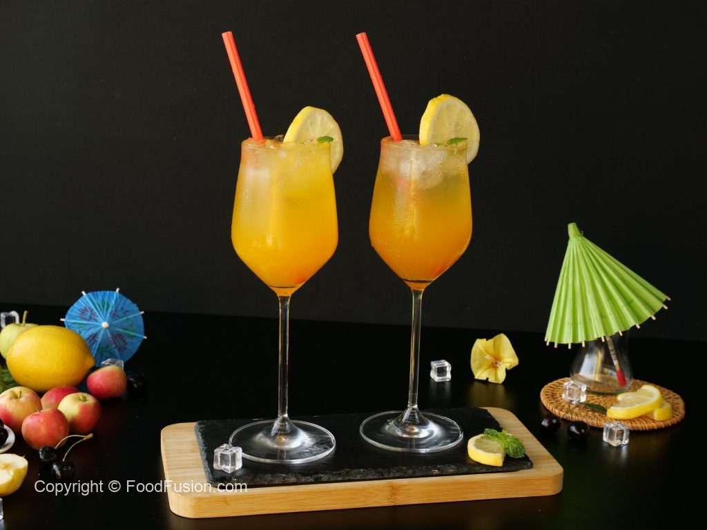 In a serving glass,add prepared lemon syrup,pineapple juice,orange juice,ice & 7up.