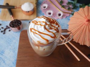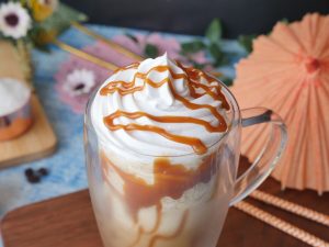 Pour Caramel Frappuccino, garnish with whipped cream and caramel sauce.