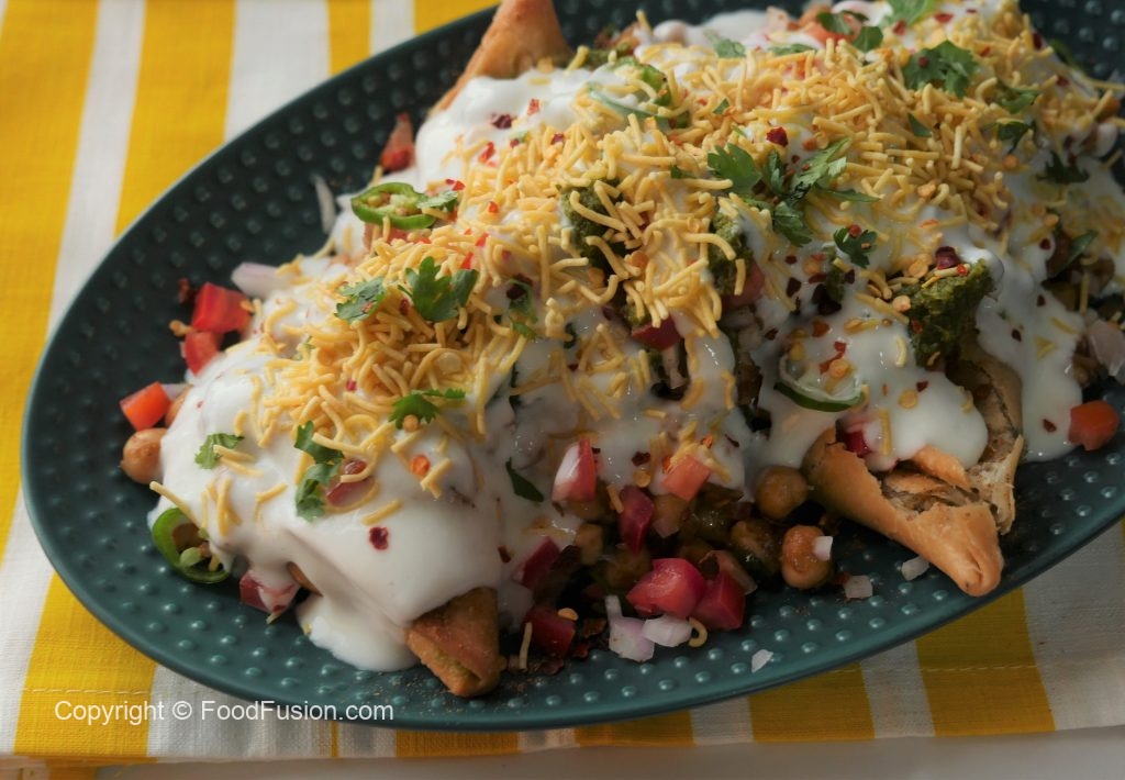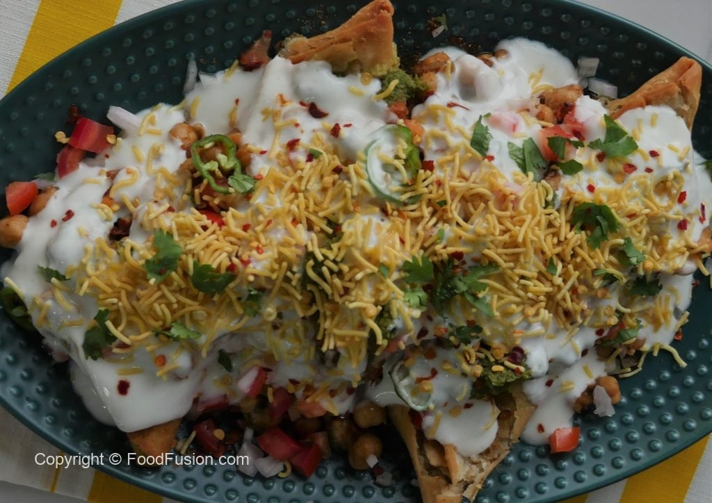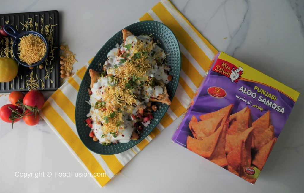 Serving dish mein fried samosa dal ker slightly crush karein,cooked chanay,pyaz,tamatar,hari mirch, chaat masala,lal mirch crushed,lemon juice,hari chutney,dahi,nomco sev,hara dhania aur lal mirch crushed dal ker serve karein.