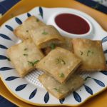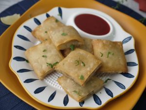 Take samosa sheet/manda patti and cut into four equal parts/strips,place one samosa patti/strip horizontally,apply all-purpose flour skurry,place second samosa patti vertically over first one,it will make plus (+) sign.