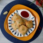 Take samosa sheet/manda patti and make pocket,add paneer filling in the center (1 tbs) and roll into the shape of samosa and seal corners with all-purpose flour slurry.