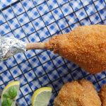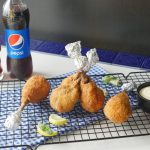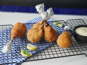 Now coat chicken lollipops in dry flour mixture,dip into beaten eggs then coat in breadcrumbs.