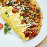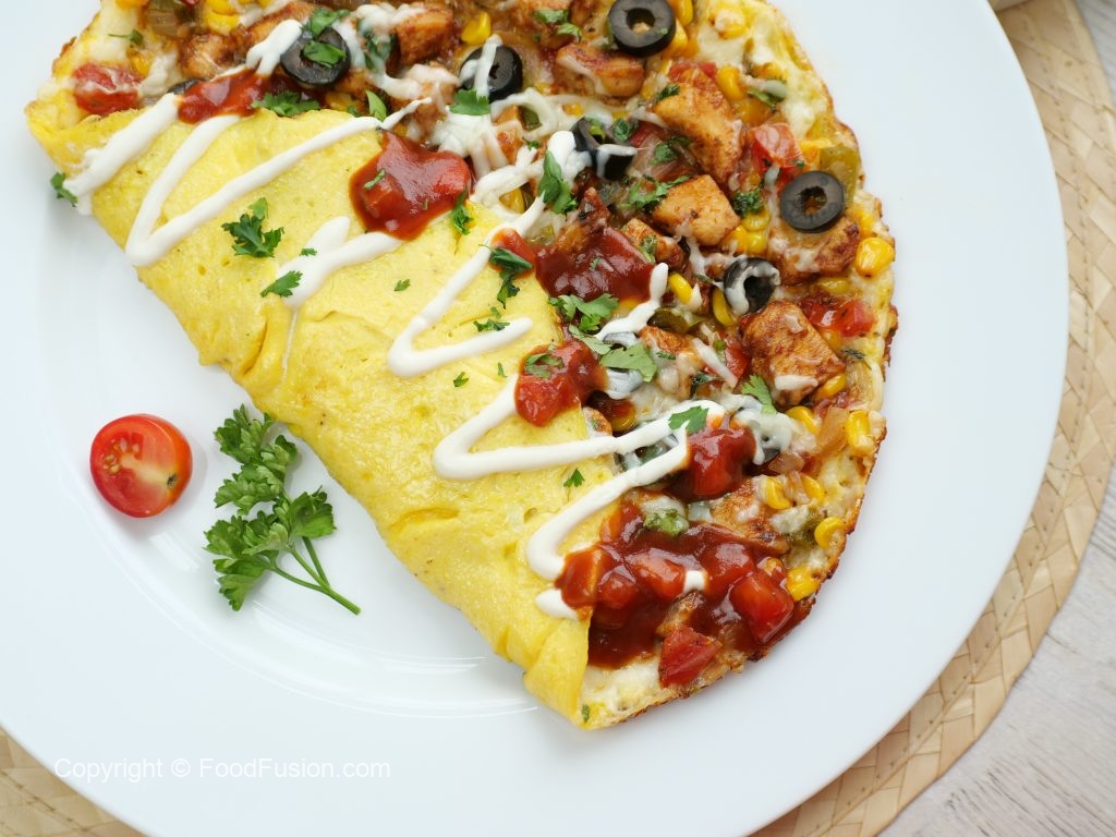 -On one side of the omelette,add grated cheddar cheese & mozzarella cheese,prepared vegetable, prepared taco chicken,black olives,fresh coriander,cheddar cheese,mozzarella cheese & flip the other side of egg,cover & cook on low flame until cheese melts (1-2 minutes).