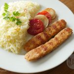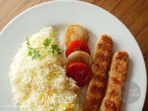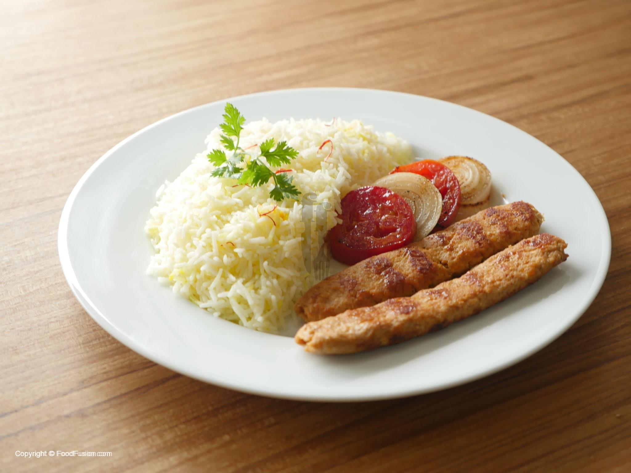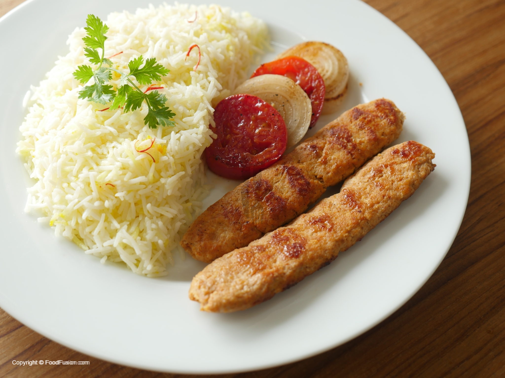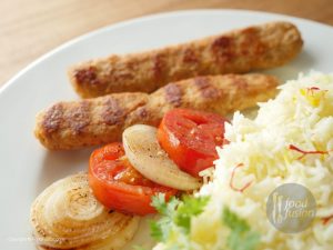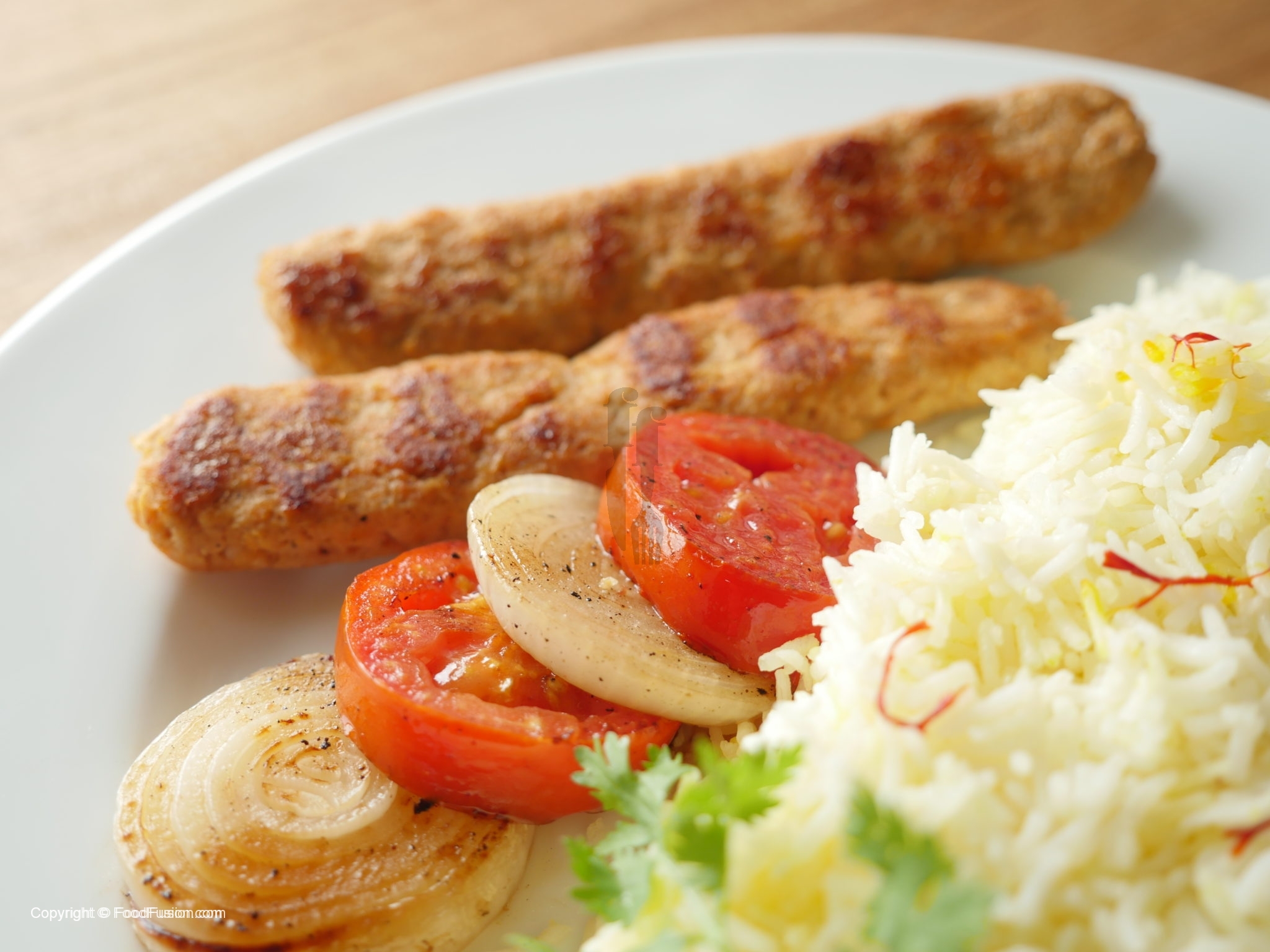 Serve chelo kebabs with butter rice,onion and tomatoes.