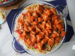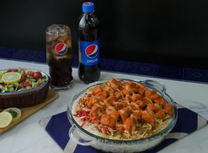 In serving dish,add boiled rice,red chili+garlic tadka,cooked vegetables,cooked tandoori chicken and drizzle prepared sauce & serve!