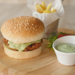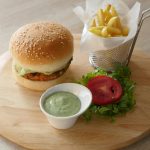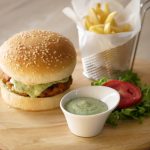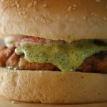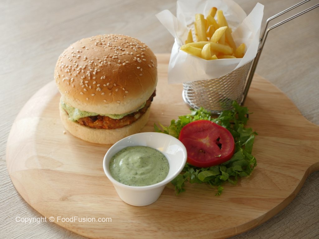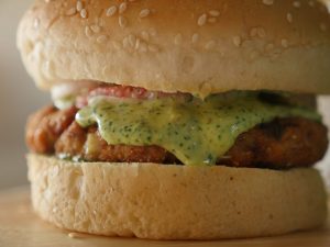 -On burger bun,add & spread green chutney,add onion rings,chicken chapli kabab,tomato slice,onion rings,green chutney and top with another bun & serve.