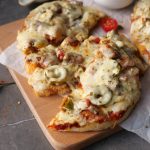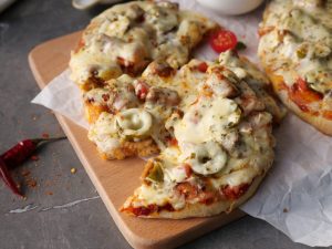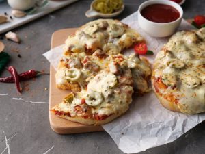 -Add & spread pizza sauce,add cooked chicken,onion,tomato,pickled jalapenos,mozzarella cheese,cheddar cheese,dried oregano & red chilli crushed (makes 6).