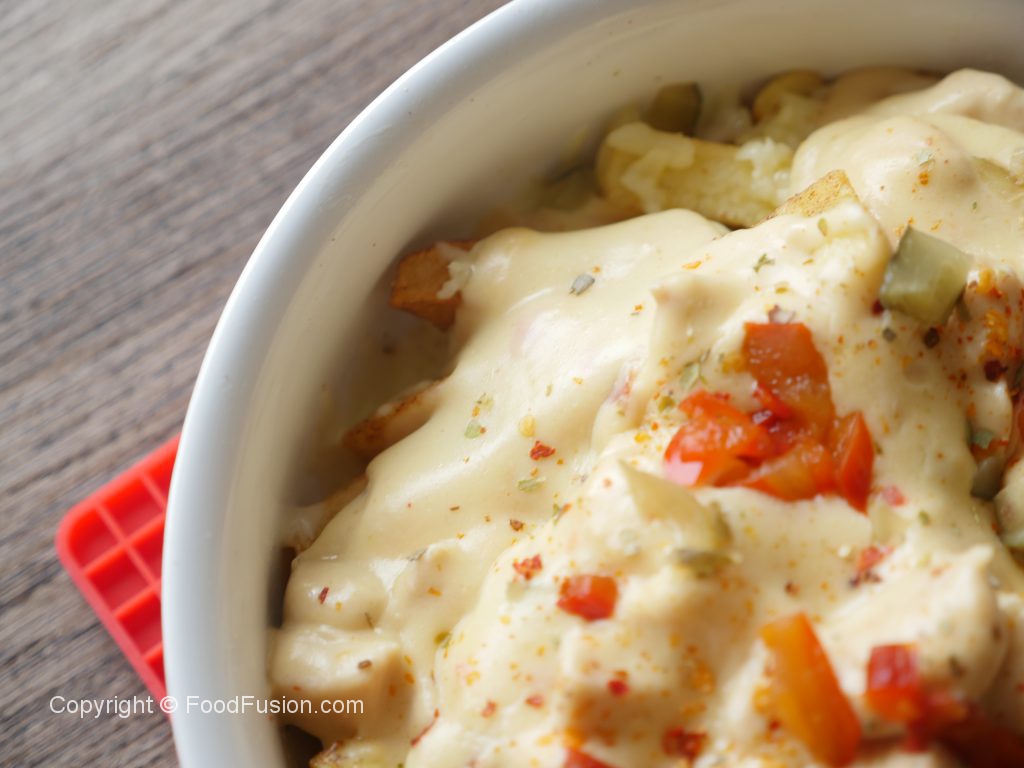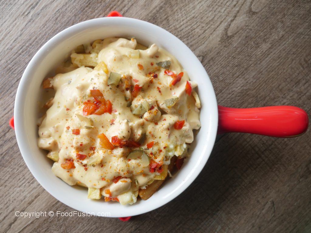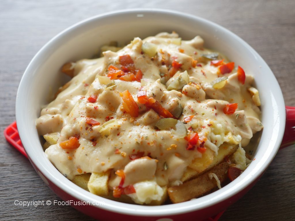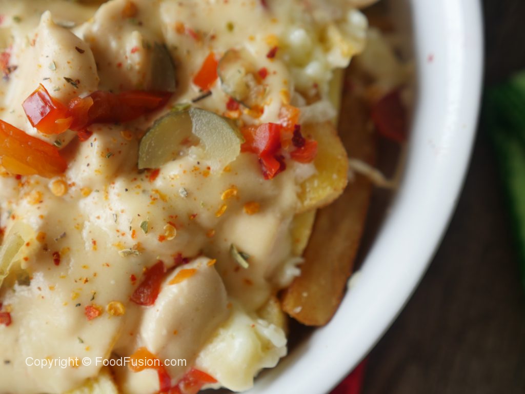 In serving platter,add potato fries,prepared seasoning and mix well then add mozzarella cheese,red jalapenos pepper,pickled cucumber,prepared white sauce,red chili crushed,dried oregano,red jalapenos pepper,pickled cucumber & serve!