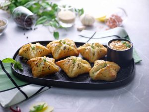 -Add prepared chicken filling (1 tbs) & mozzarella cheese then fold & seal all sides to make a pyramid shape & freeze for 1 hour (makes 8-10).