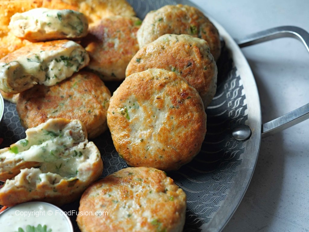 -Grease hands with cooking oil,take 70g of chicken mixture,flatten it,add cheese filling (1 tbs) & cover properly to make a kabab (makes 12).