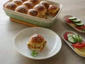 Baking dish mein burger buns rakh ker tomato ketchup,cheddar cheese,cooked chicken mixture,pickled cucumber,pyaz slices aur mozzarella cheese slices dal ker upper sa top buns rakh dein.