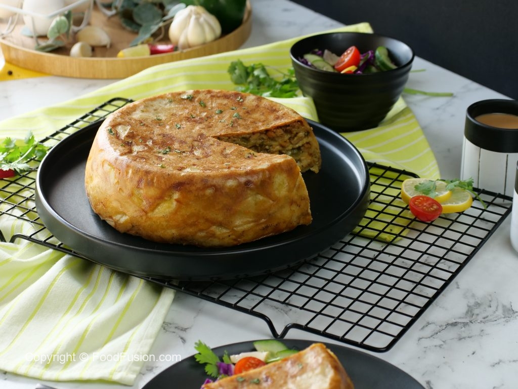-Add egg slices & keep repeating the process till the last spring roll pastry is layered on the top and fold the edges & set (repeat 3 more layers of roll sheet & filling).