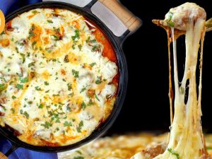 -Dip the next two spring pastry into the whisked eggs and lay on the top and again add chicken tikka filling,cheddar cheese & mozzarella cheese.Repeat 2 layers of roll sheet & filling.