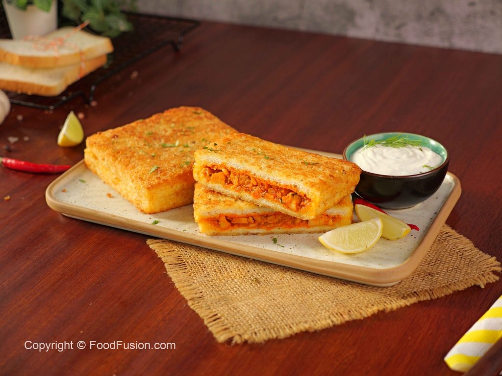 -Aik bread slice par tayar chicken tikka mixture dalein aur evenly spread karen, doosri bread slice se cover karen aur spatula se press karen.