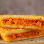 -Add prepared chicken tikka mixture, spread it, cover with another bread slice, press with spatula.