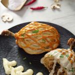 -Place it in a baking tray (greased & lined with baking paper), refrigerate for 15-20 minutes, apply egg wash, garnish with thyme leaves.