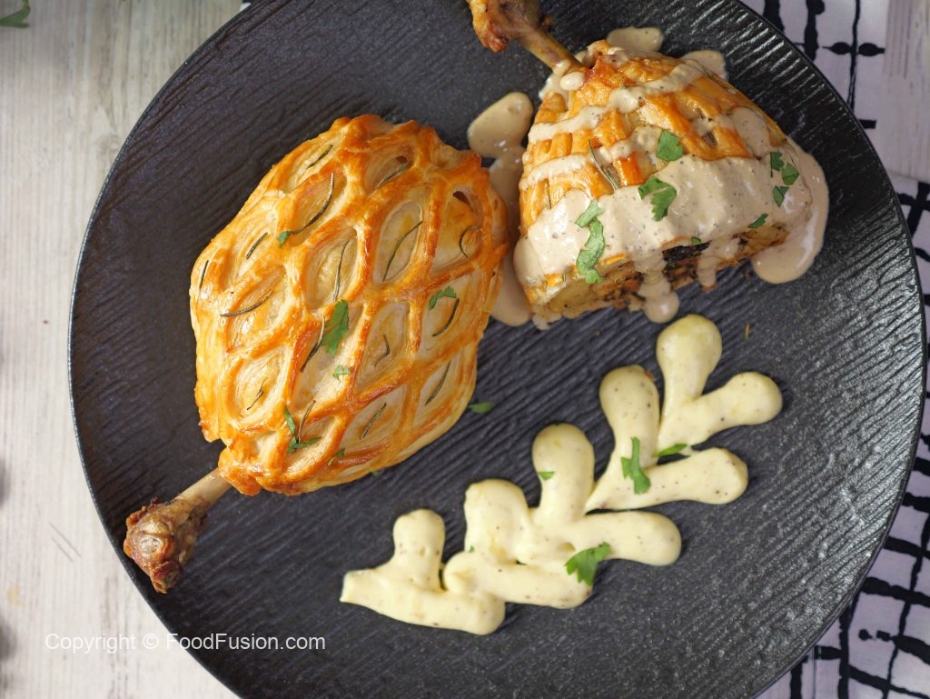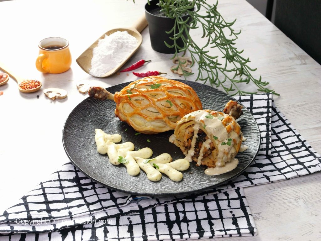 -Chicken wellington ko mustard sauce aur mashed potatoes ke saath serve karein.