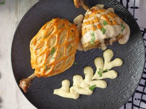 -Serve chicken wellington with mustard brown sauce & mash potatoes.