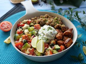 -On a bed of lettuce leaves,add onion,corn kernels,cherry tomatoes,grilled chicken,iceberg,avocado, boiled eggs,pour prepared salad dressing & serve!