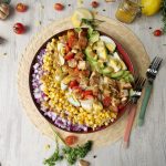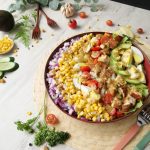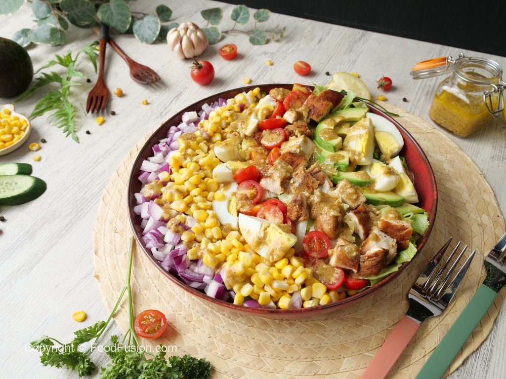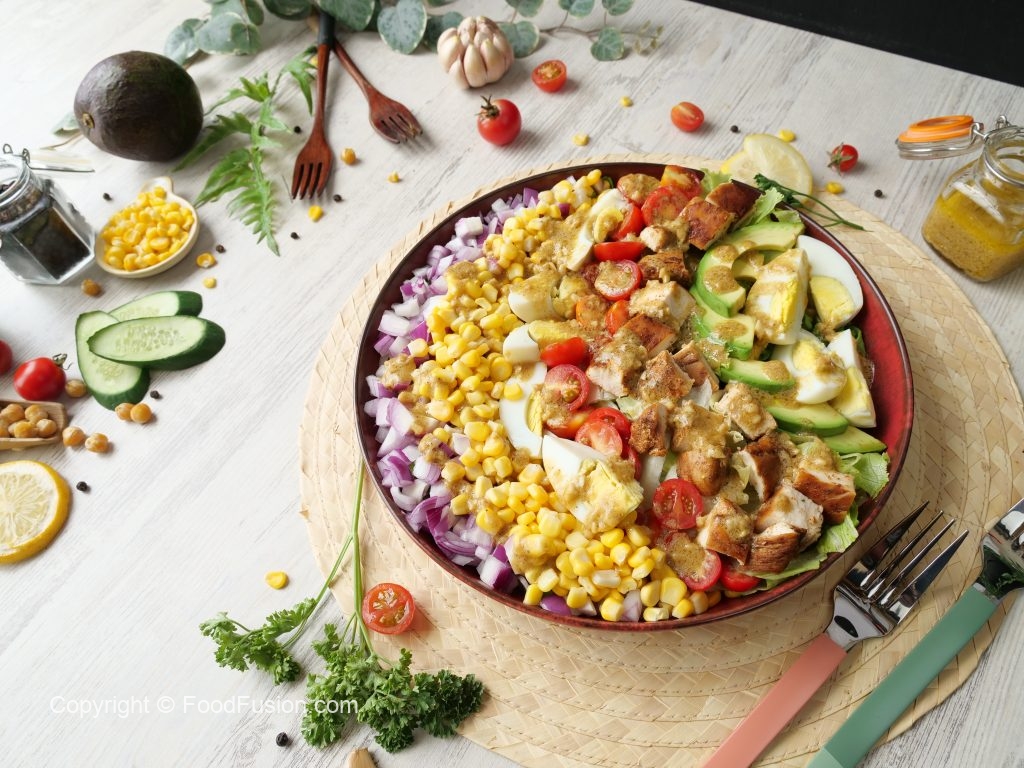 -Lettuce bed per pyaz,corn kernels,cherry tomatoes,grilled chicken,iceberg,avocado,boiled anday aur tayyar salad dressing dal ker serve karein!