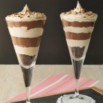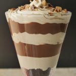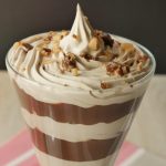 In serving glass,add crumbled brownie,coffee whipping cream,crushed coffee candy,prepared chocolate custard,coffee whipping cream and crushed coffee candy.