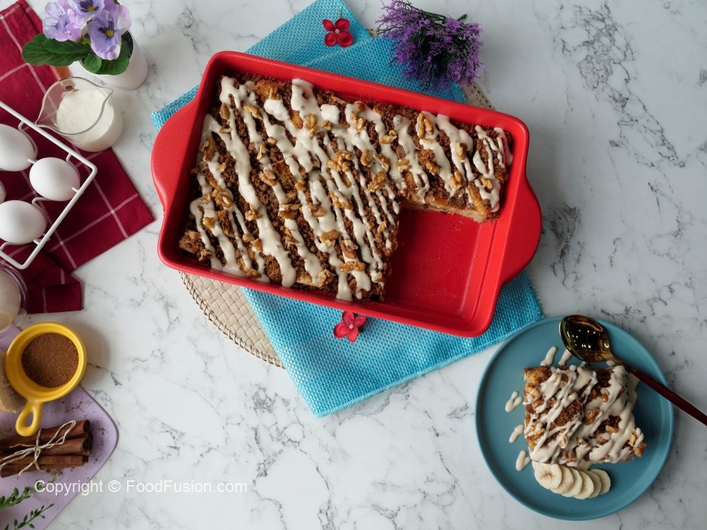 Greased casserole mein French bread cubes aur tayyar egg & cream mixture dal ker gently press ker lein aur cling film sa cover ker ka 30 minutes kliya refrigerator mein rakh dein.