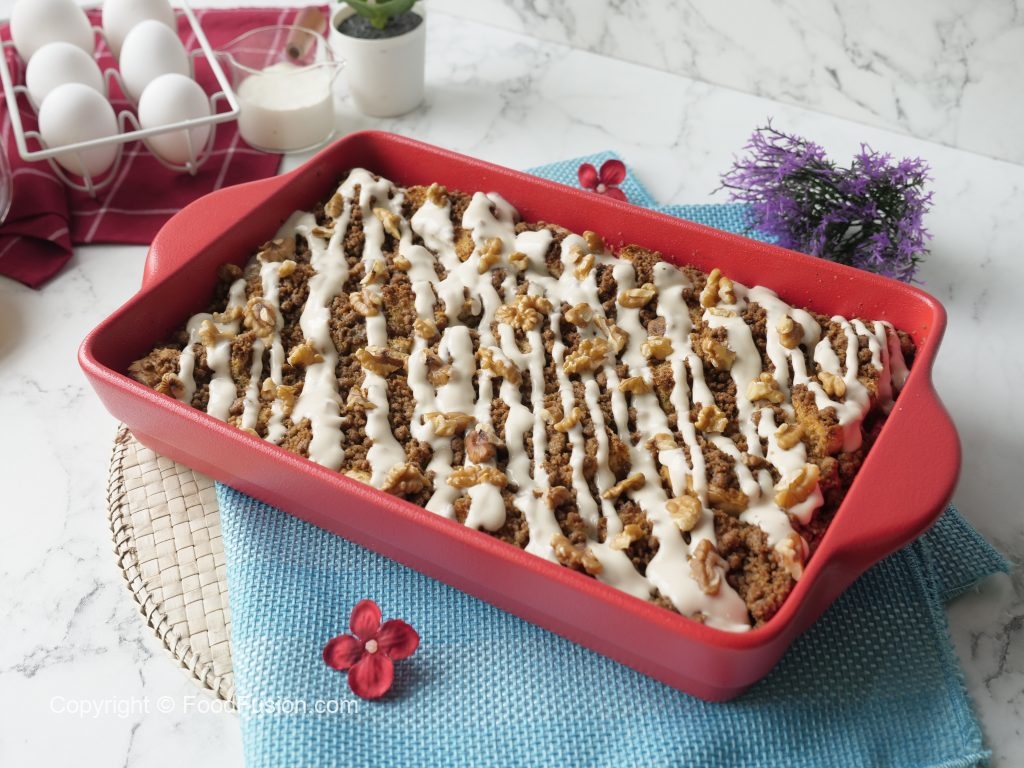 Tayyar cream sauce ko drizzle ker ka akhrot dal dein.