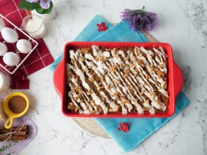 Add eggs,cinnamon powder,vanilla essence and cream,whisk well & set aside.