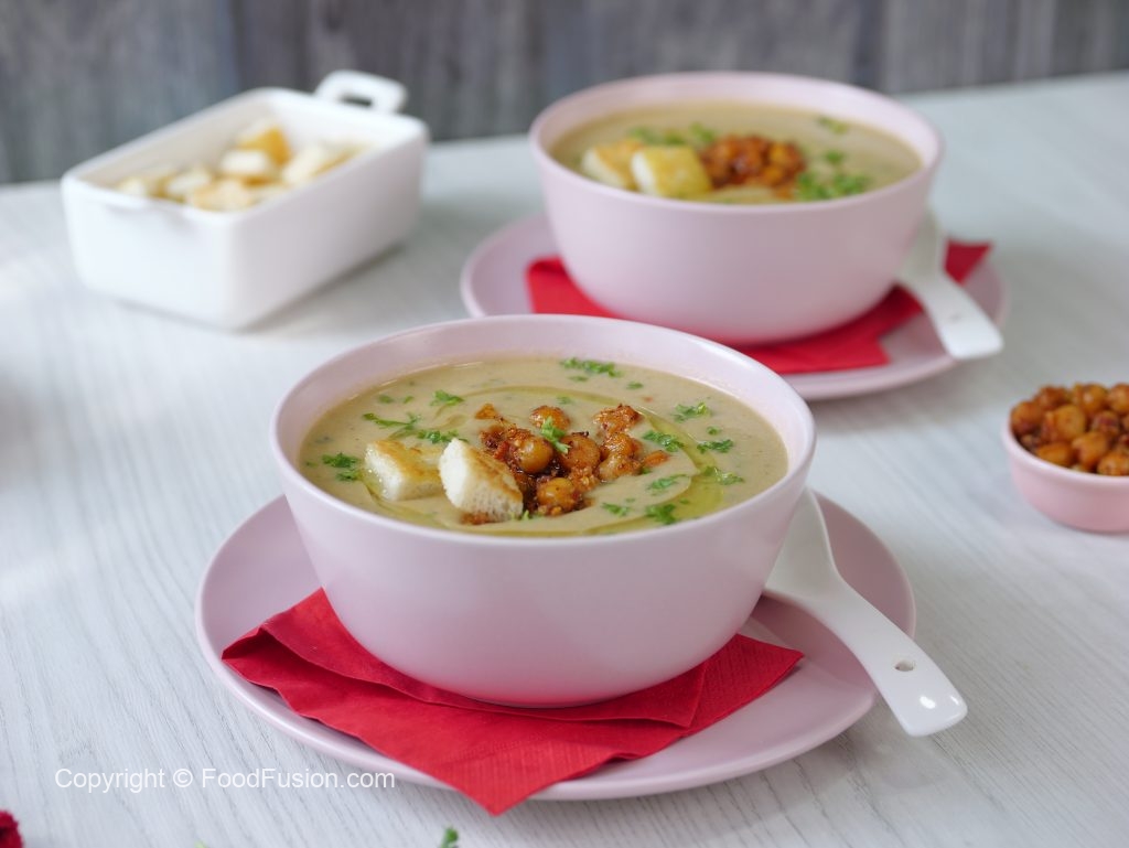 -Garnish with prepared garlicky chickpea topping,fresh parsley,croutons,olive oil & serve hot!