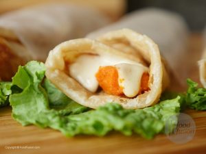 Add and spread chili garlic sauce,add mozzarella cheese,green onion leaves,cooked chicken pieces, coleslaw in the center and fold the top side so that it covers the filling.