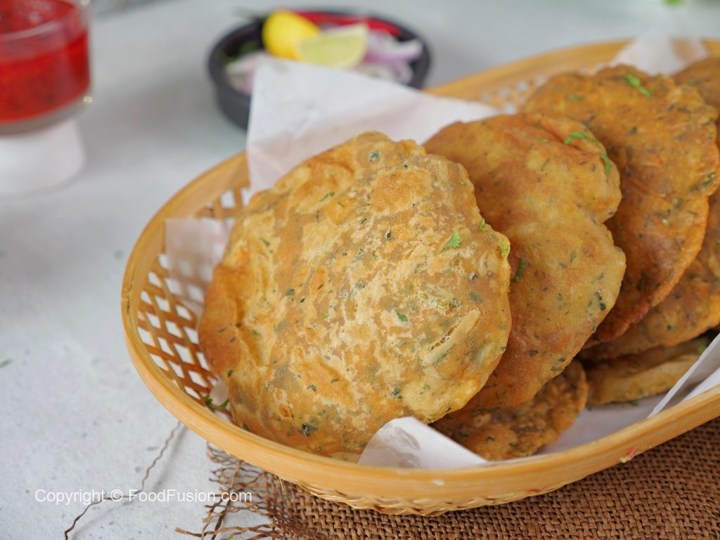 -Dust dry flour & roll out with the help of a rolling pin, make 5 inches puri. (Makes 13-14)