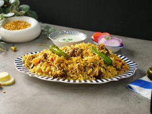 -In a bowl,add yogurt,fried onion,coriander powder,red chilli powder,cumin powder,turmeric powder, garam masala powder,pink salt,mace powder,nutmeg powder,dried plums,tamarind,tomato,mint leaves,fresh coriander & mix well.
