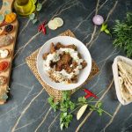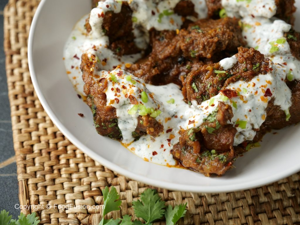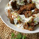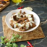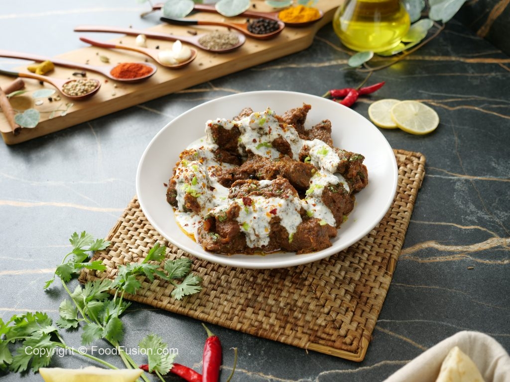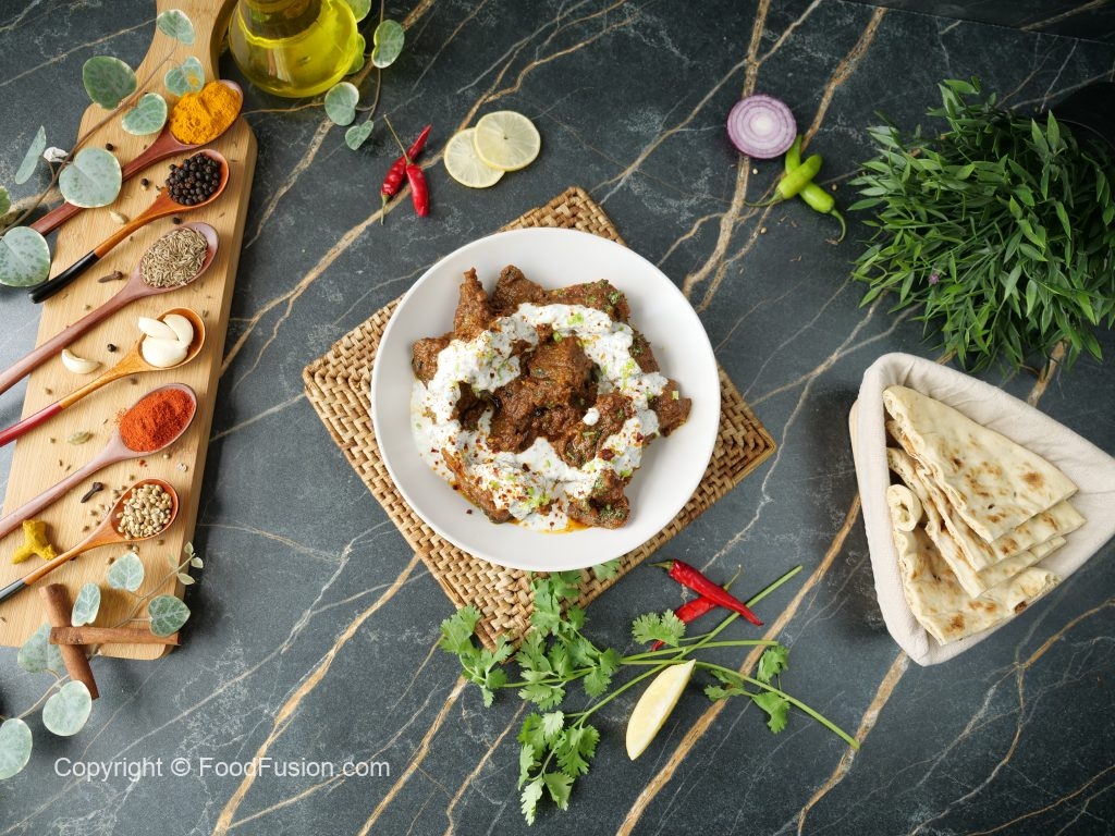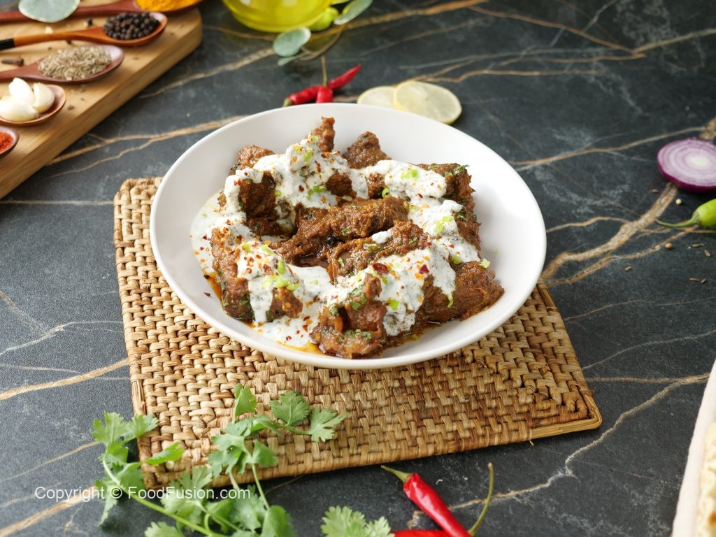 Drizzle prepared yogurt sauce on smokey dahi beef masala,sprinkle green chilli,red chilli crushed & serve with naan!
